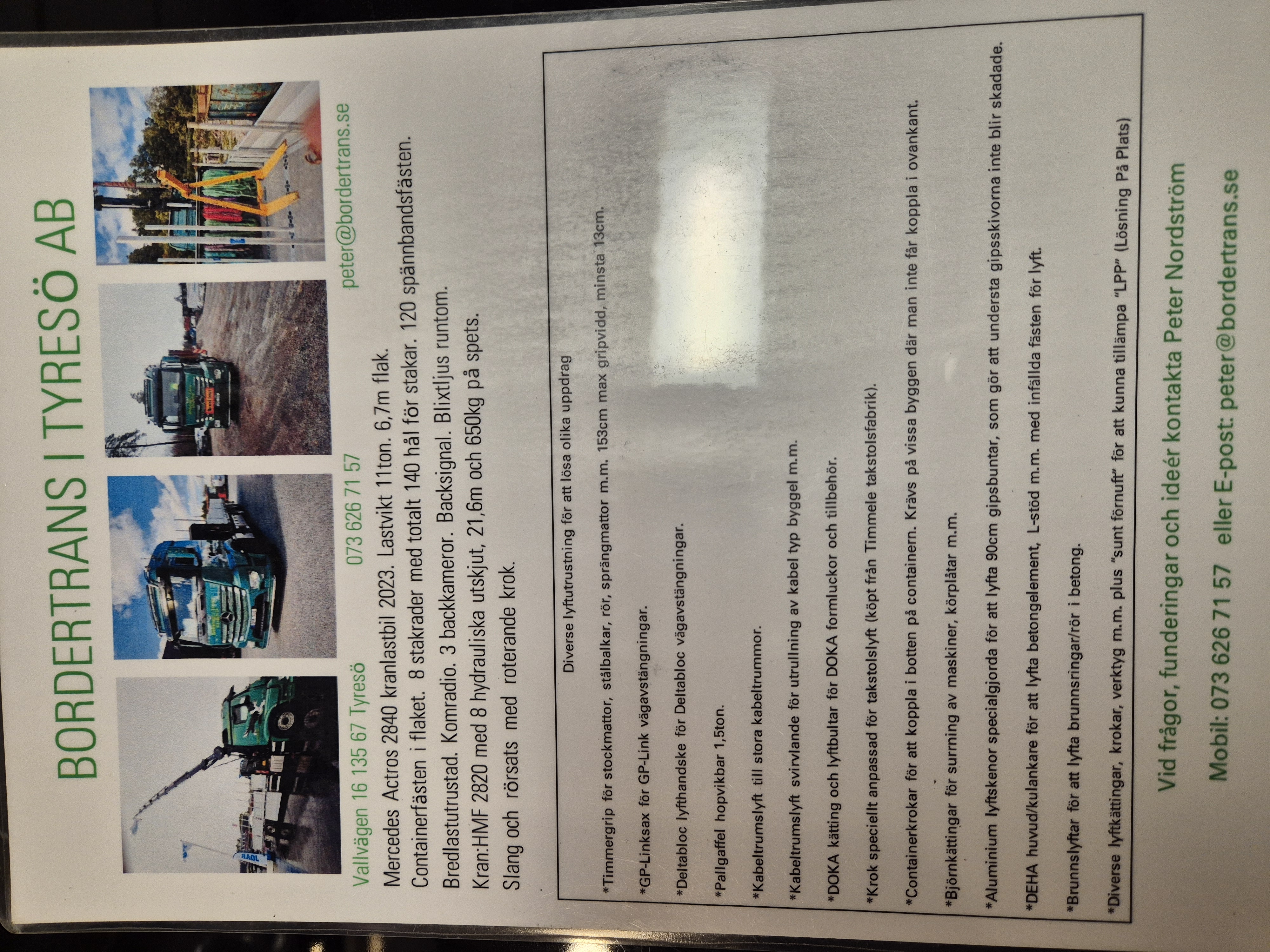 Du kan kontakta oss via telefon på +46736267157 eller skicka e-post till peter@bordertrans.se för en förfrågan om en transport med kranlastbil.